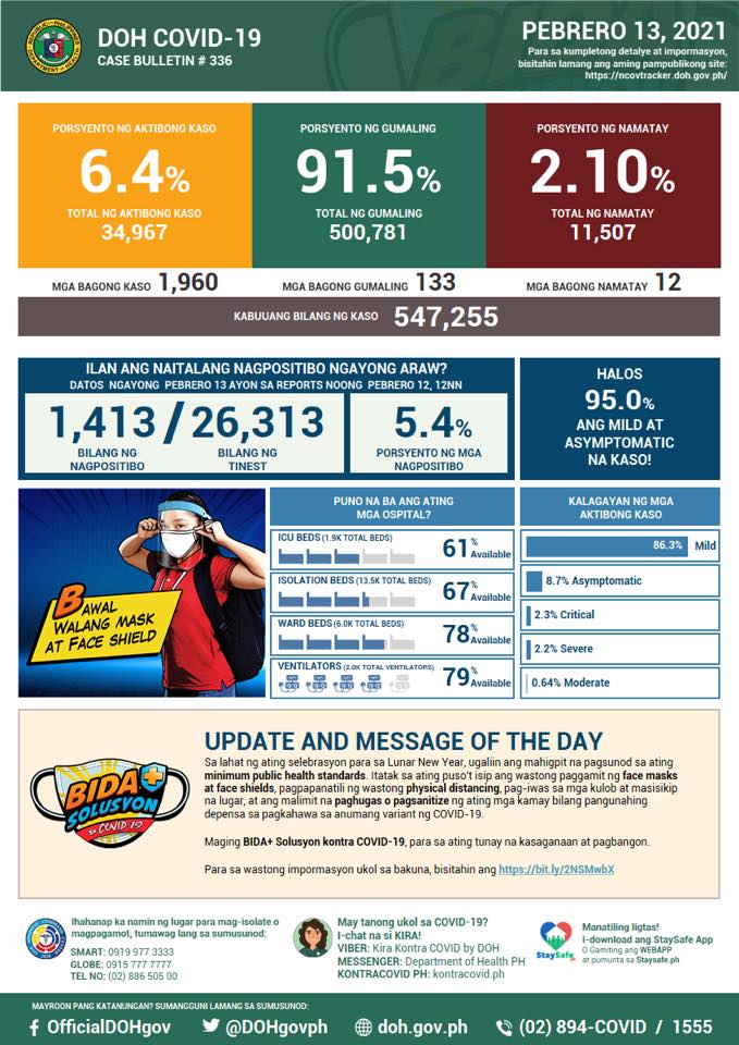 NAKAPAGTALA pa ng 1,960 na bagong kaso ang Covid-19 sa bansa dahilan para umakyat na sa kabuuang bilang na 547,255 ang nagpositibo sa nakamamatay na sakit batay sa case bulletin update ng Department of Health ngayong Sabado, Pebrero 13.