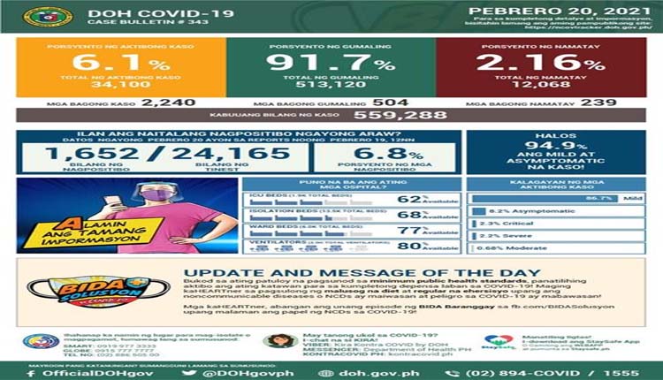Ayon sa DOH ng kabuuang 559,288 kaso ng Corona virus disease sa Pilipinas dahil sa 2,240 na nadagdag ngayong hapon.