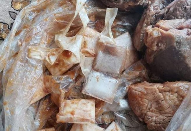 Matapos mahiwa ang mga karne tumambad sa kanila ang 10 plastic sachets ng hinihinalang shabu at dalawang sachet na naglalaman ng mga foil.