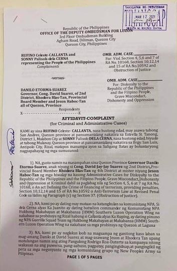 SINAMPAHAN ng kasong disloyalty to the Republic of the Philippines and the filipino people, Republic act 10592 o anti-terrorism law, dishonesty at oppression sa Ombudsman ang mag-amang sina Quezon Gov. Danilo Suarez at Cong. David ‘Jayjay’ Suarez; mag-asawang board member Rhodora Tan at Jeson Haboc-Tan.