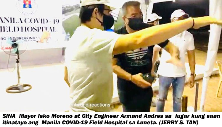 Samantala ay dinalaw ni Moreno ang pagtatayuan ng Manila COVID-19 Hospital sa Luneta Park kasama si City Engineer Armand Andres na nagsabing ang kanyang mga tauhan ay round-the-clock na nagtatrabaho upang masapul ang target na matapos ito sa loob ng 60-araw na mismong si Moreno ang nagtakda. Dito ay kinausap ni Moreno ang mga manggawa at pinasalamatan ang mga ito. (ANDI GARCIA)