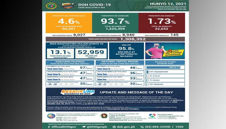 Sa kabuuang bilang ng mga naitalang kaso sa bansa, 4.6% (60,341) ang aktibong kaso, 93.7% (1,225,359) na ang gumaling, at 1.73% (22,652) ang namatay.