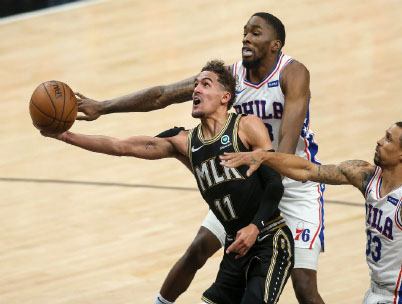NAGPASABOG si Trae Young ng 25 points at nagdagdag ng 18 assists upang tulungan ang Atlanta Hawks na ilista ang manipis na 103-100 laban sa makulit na Philadelphia 76ers sa Game 4 ng kanilang Eastern Conference playoff series sa State Farm Arena, sa Atlanta.