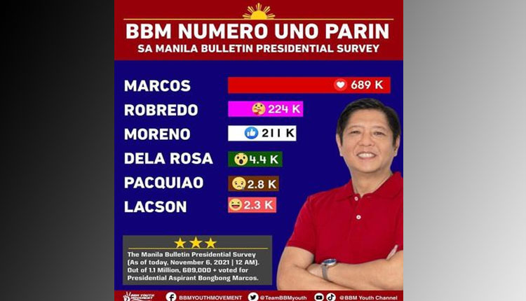 Sa hiwalay namang presidential survey ng pahayagang Manila Bulletin, nasa 1.1 million netizens ang tumugon dito kung saan higit 689,000 ang nagsabing si Marcos ang kanilang iboboto.